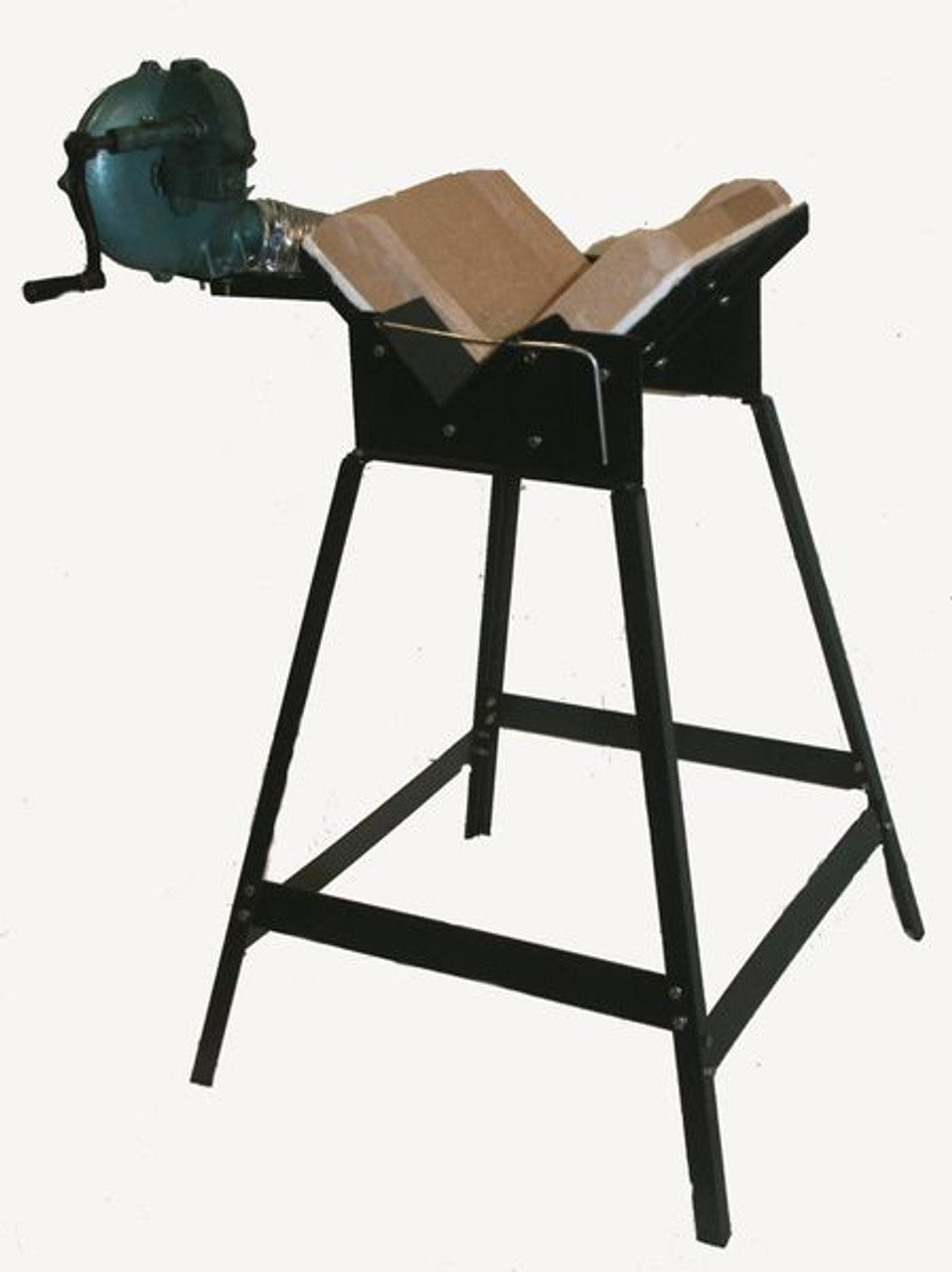 - Blower options include a light duty electric fan (50 cfm) with a stomp switch that latches on/off, or the Cast Aluminum hand-crank blower. Either of them will come with a mounting bracket, duct and hardware when ordered with the forge from this page.