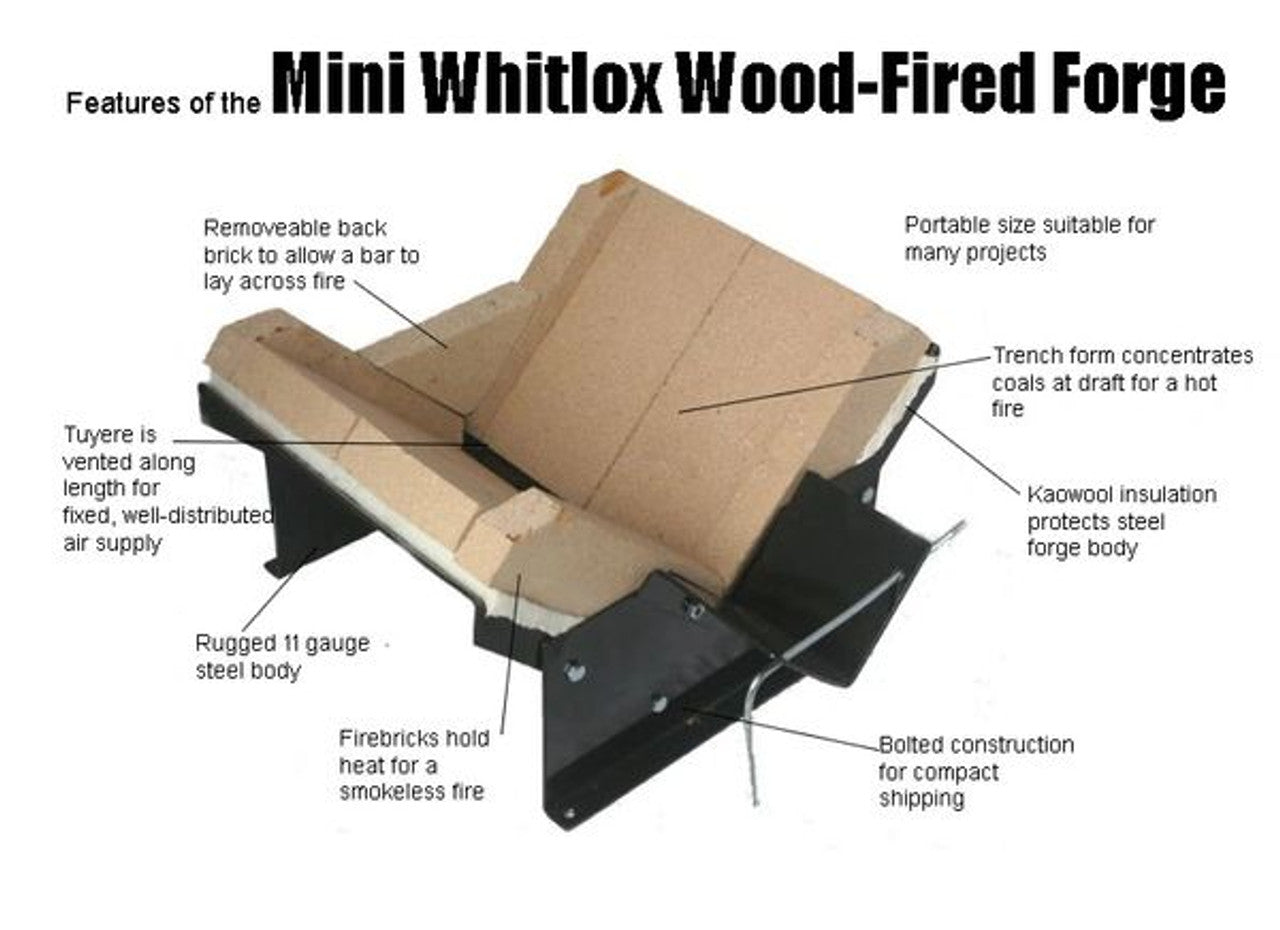 Whitlox Homestead created the Mini Forge to answer the need for an inexpensive forge for beginners or for smiths who take their set up to events and want something more mobile. Like the fullsize Whitlox Wood-Fired Forge, the Mini is constructed of 11 gauge steel, lined with kaowool and firebricks to keep heat in and preserve the steel. The compact size (16"x16"x9") is ideal for many projects. The inside length of the firebed is 9".